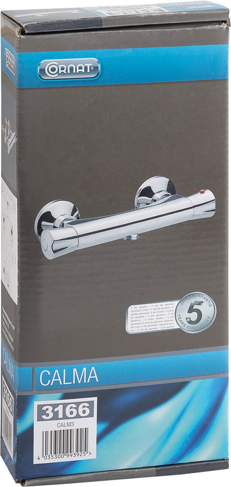 De "Calma" douchemengkraan van Cornat past in elke douche dankzij het klassiek elegante design. Hij is ideaal voor aansluiting op een doorstroomverwarmer of de centrale warmwatervoorziening. De gewenste watertemperatuur kan eenvoudig worden ingesteld met de temperatuurkeuzehendel. De thermostaat zorgt voor een constante temperatuur tijdens het douchen en vermindert zo waterverspilling. Met het lichtlopende bedieningselement aan de andere kant van de mengkraan kun je het debiet gemakkelijk regelen. De warmwaterblokkering op 38° beschermt ook betrouwbaar tegen te heet water en is dus ideaal voor huishoudens met kinderen.