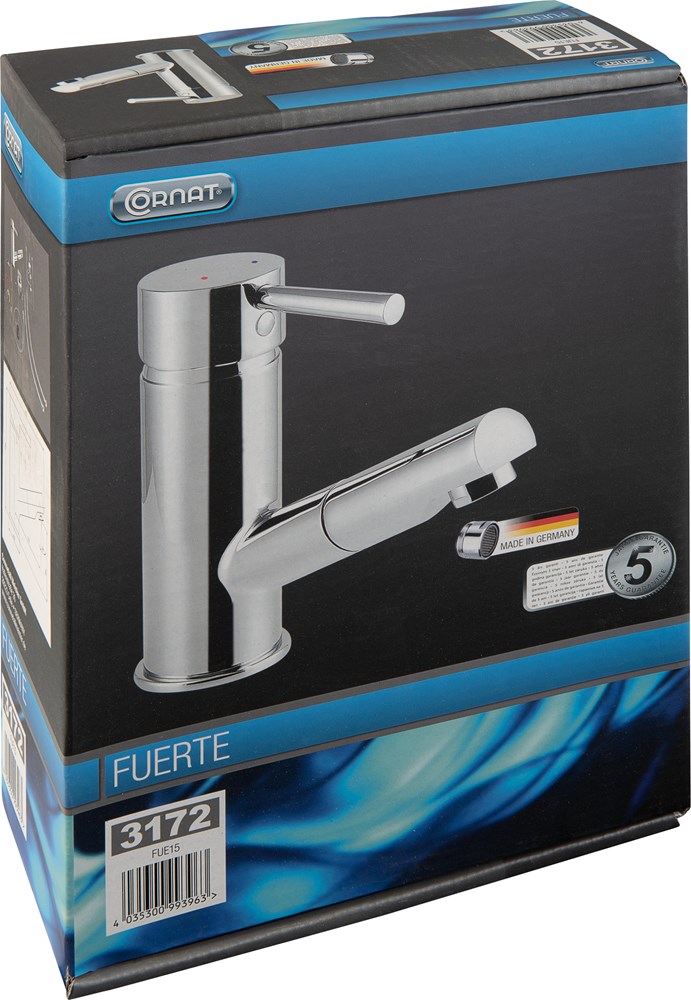 De "Fuerte" wastafelmengkraan van Cornat is geschikt voor elke wastafel dankzij het klassiek elegante design. Hij is bij uitstek geschikt voor aansluiting op een doorstroomverwarmer of de centrale warmwatervoorziening. Met de lichtlopende bedieningshendel kun je het debiet en de temperatuur precies en gemakkelijk instellen. De beluchter verrijkt het uitstromende water automatisch met lucht en zorgt voor een merkbaar zachte straal, terwijl het waterverbruik daalt. Storende stromingsgeluiden worden betrouwbaar geminimaliseerd en ongecontroleerd spatten van het water wordt voorkomen. De praktische uittrekbare sproeikop maakt ook handige bediening buiten de wastafel mogelijk en zorgt voor meer flexibiliteit, bijvoorbeeld bij het vullen van een schoonmaakemmer.