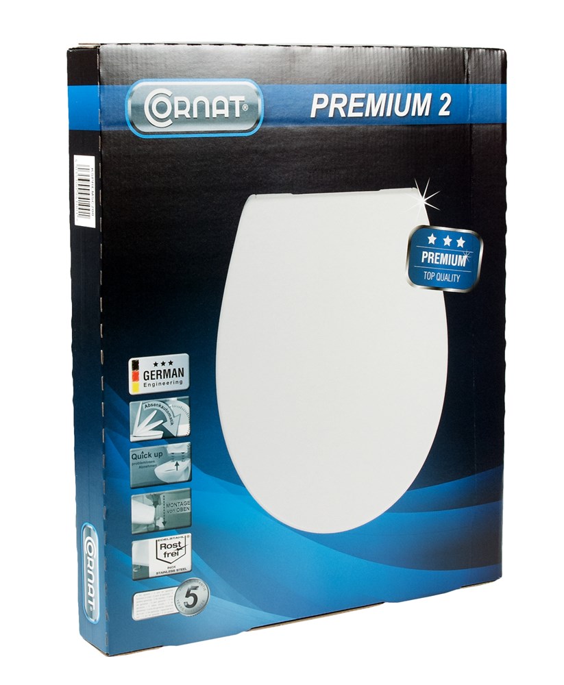 De ochtend begint in de badkamer. De Cornat Premium toiletzitting biedt je niet alleen het comfort dat je nodig hebt, maar de technische details zorgen ook voor een optimaal gebruik in premium kwaliteit. De zitting kan eenvoudig en comfortabel van bovenaf worden geïnstalleerd met behulp van de hoogwaardige bevestiging. De zitting is gemaakt van antibacterieel Duroplast en garandeert maximale hygiëne. Dankzij het gladde oppervlak krijgen vuil en ziektekiemen geen kans. Het is ook zeer goed bestand tegen chemicaliën, dus regelmatige desinfectie van de toiletzitting is geen probleem. Bovendien kun je met de Quick up & Clean-functie het deksel snel en eenvoudig verwijderen met één druk op de knop, zodat niets een grondige reiniging in de weg staat. Het geïntegreerde soft-close mechanisme is ook bijzonder praktisch: een licht tikje op het deksel volstaat om het zachtjes en geruisloos te sluiten. Met zijn elegante en vlakke look in effen wit past het model naadloos in elke badkamer. Het model overtuigt door zijn hoogwaardige afwerking en lange levensduur. Ontwikkeld en ontworpen in Duitsland met productie in Europa, voldoet het aan de hoogste kwaliteitsnormen.