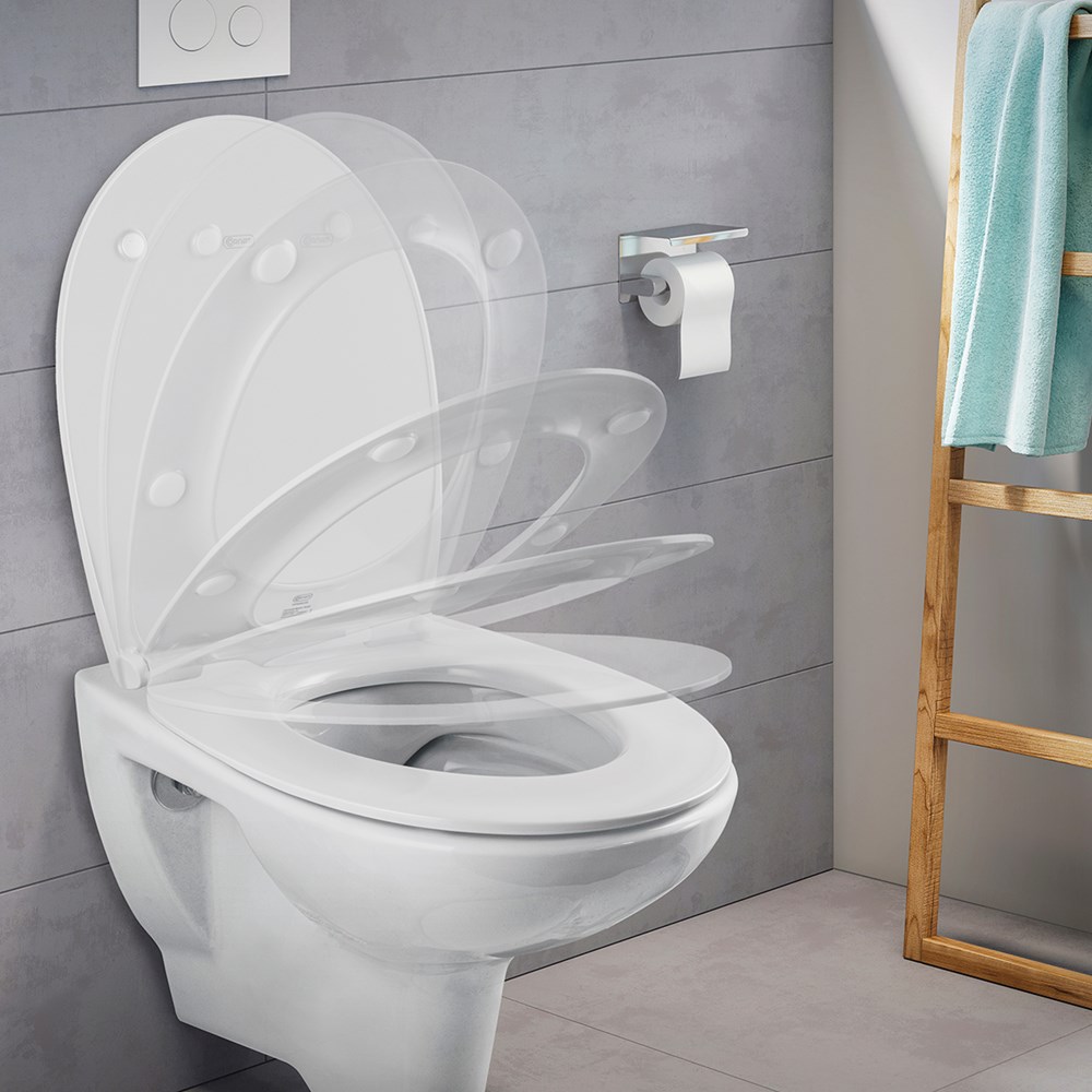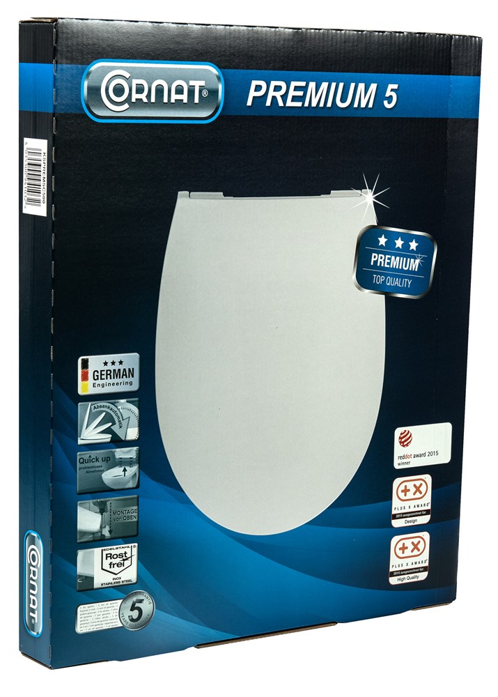 De ochtend begint in de badkamer. De Cornat Premium toiletzitting biedt je niet alleen het comfort dat je nodig hebt, maar de technische details zorgen ook voor een optimaal gebruik in premium kwaliteit. De zitting kan eenvoudig en comfortabel van bovenaf worden geïnstalleerd met behulp van de hoogwaardige bevestiging. De zitting is gemaakt van antibacterieel Duroplast en garandeert maximale hygiëne. Dankzij het gladde oppervlak krijgen vuil en ziektekiemen geen kans. Het is ook zeer goed bestand tegen chemicaliën, dus regelmatige desinfectie van de toiletzitting is geen probleem. Bovendien kun je met de Quick up & Clean-functie het deksel snel en eenvoudig verwijderen met één druk op de knop, zodat niets een grondige reiniging in de weg staat. Het geïntegreerde soft-close mechanisme is ook bijzonder praktisch: een licht tikje op het deksel is voldoende om zachtjes en geruisloos te sluiten. Met zijn superstrakke design in effen wit past het model naadloos in elke badkamer. Het model overtuigt door zijn hoogwaardige afwerking en lange levensduur. Ontwikkeld en ontworpen in Duitsland met productie in Europa, voldoet het aan de hoogste kwaliteitsnormen.
