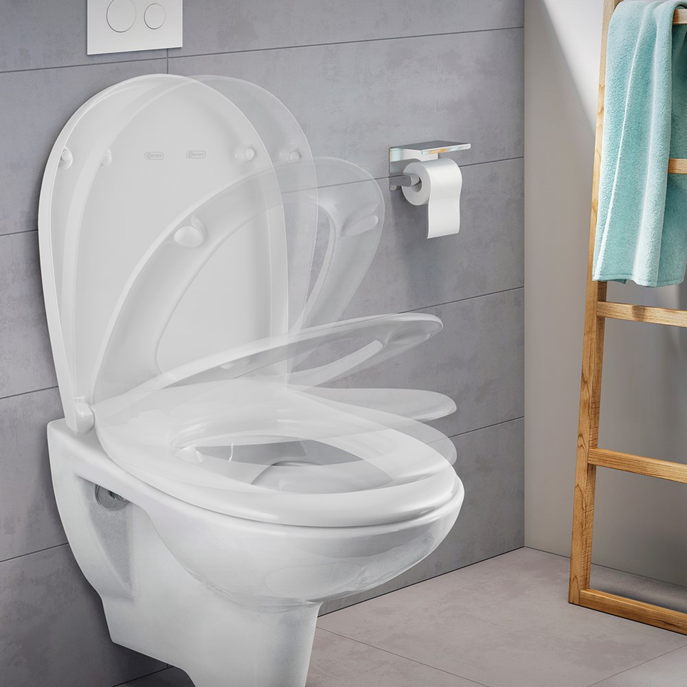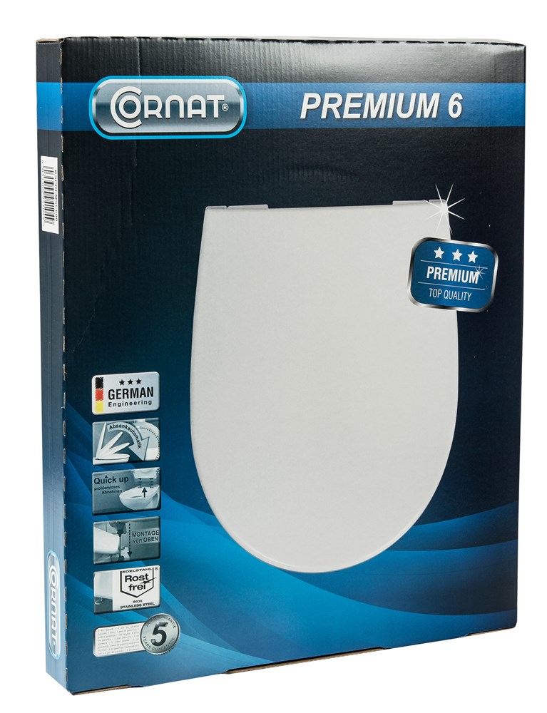 De ochtend begint in de badkamer. De Cornat Premium toiletzitting biedt je niet alleen het comfort dat je nodig hebt, maar de technische details zorgen ook voor een optimaal gebruik in premium kwaliteit. De zitting kan eenvoudig en comfortabel van bovenaf worden geïnstalleerd met behulp van de hoogwaardige bevestiging. De zitting is gemaakt van antibacterieel Duroplast en garandeert maximale hygiëne. Dankzij het gladde oppervlak krijgen vuil en ziektekiemen geen kans. Het is ook zeer goed bestand tegen chemicaliën, dus regelmatige desinfectie van de toiletzitting is geen probleem. Bovendien kun je met de Quick up & Clean-functie het deksel snel en eenvoudig verwijderen met één druk op de knop, zodat niets een grondige reiniging in de weg staat. Het geïntegreerde soft-close mechanisme blijkt ook bijzonder praktisch: een licht tikje op het deksel volstaat om het zachtjes en geruisloos te sluiten. Met zijn universele en ergonomische look in effen wit past het model naadloos in elke badkamer. Het model overtuigt door zijn hoogwaardige afwerking en lange levensduur. Ontwikkeld en ontworpen in Duitsland met productie in Europa, voldoet het aan de hoogste kwaliteitsnormen.