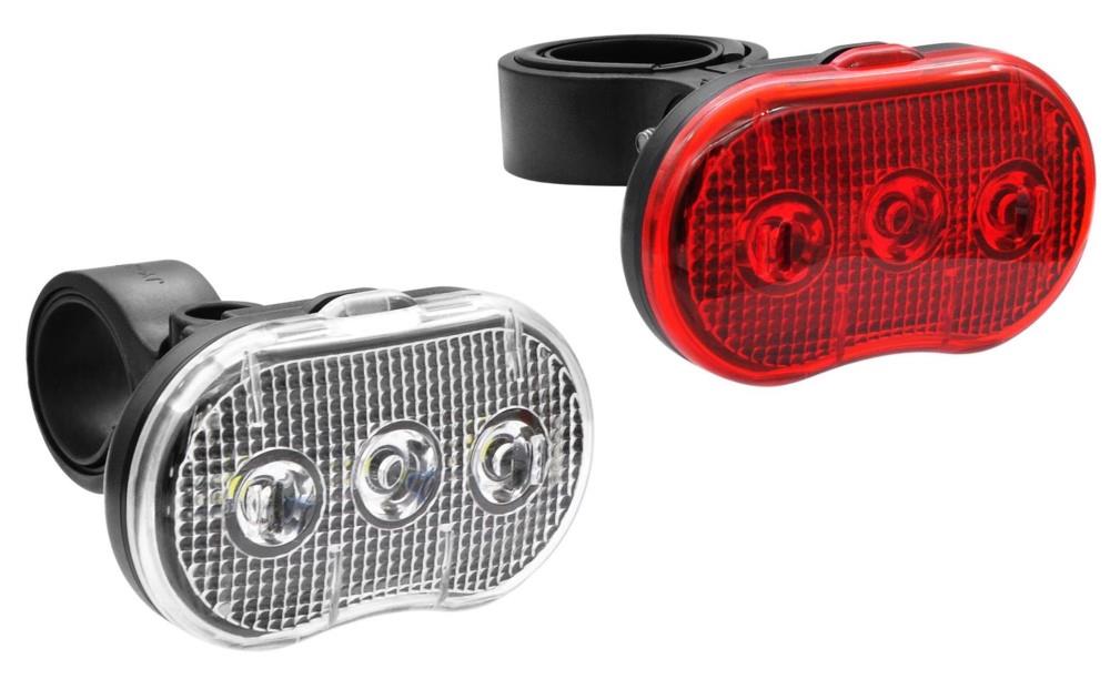 Fietsverlichtingset voor-en achterlicht met 3 LED-lampjes Eenvoudige bevestiging met kliksysteem Met reflector Aantal: 1x setje voor- en achterlicht Rood/Wit Bij de set worden 2 x 2 AAA-batterijen geleverd Afmetingen: 7 × 3 × 2 cm. Functie: Chasing/knipperen/aan/uit Waterbestendig Geschikt voor stuurdiameter: 22.2 - 25.4 mm Geschkit voor zadelpendiameter: 25.4 - 31.8 mm