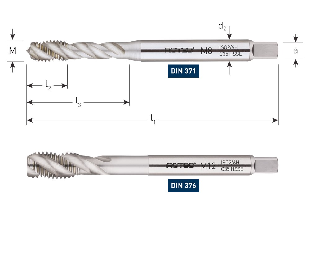 HSS-E machinetappen, DIN 371, metrisch [M], 60°, verdikte schacht, type C, spiraalhoek 35°.