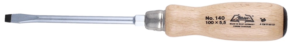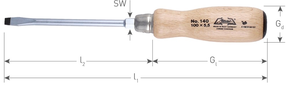 Schroevendraaier, profiel SL (Sleuf) volgens DIN ISO 2380. Met ergonomische handgreep en doorlopende gesmede ronde kling met zeskantige basis. Gemaakt van hoogwaardig verchroomd CrV-staal en voorzien van een gebruineerde tip.