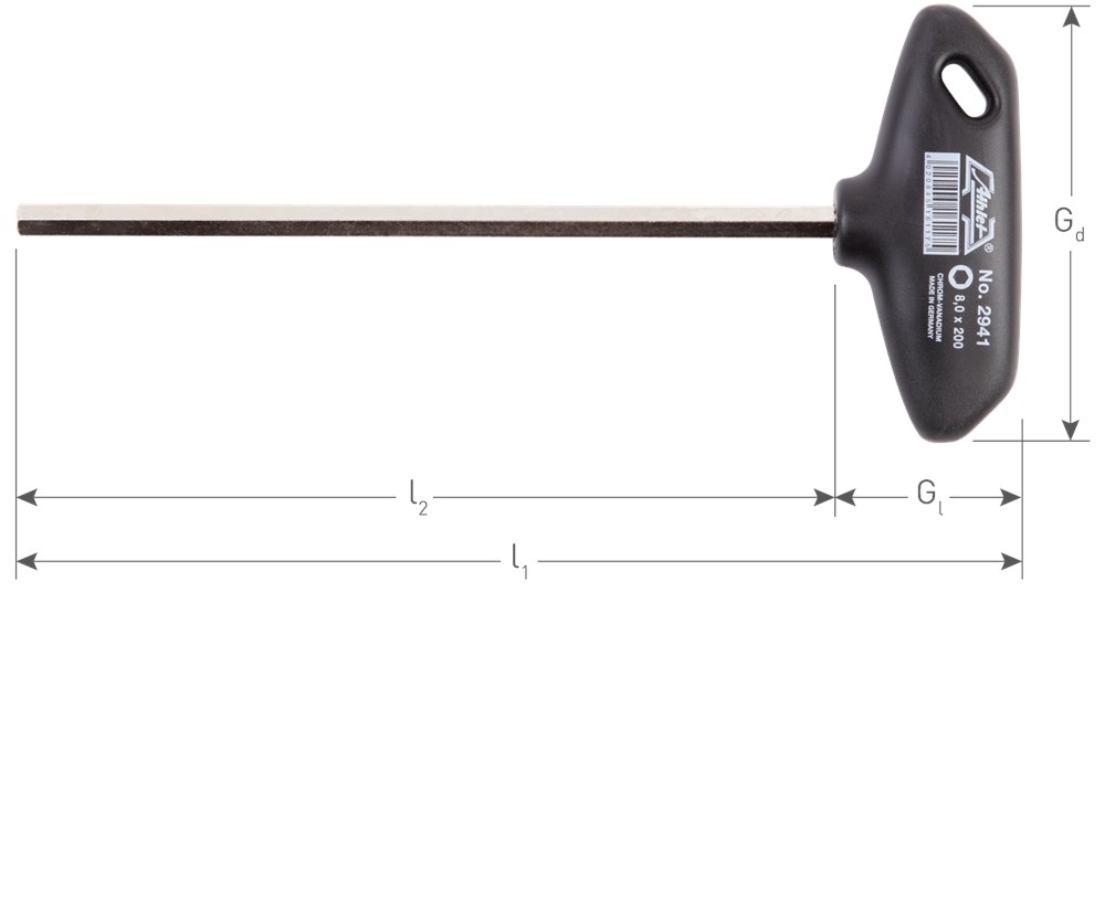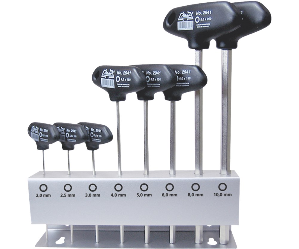 Stiftsleutelset met ergonomische T-greep gemaakt van speciaal kunststof met hoge slagvastheid en voorzien van ophanggat. Blad gemaakt uit CrV-staal, vernikkeld.