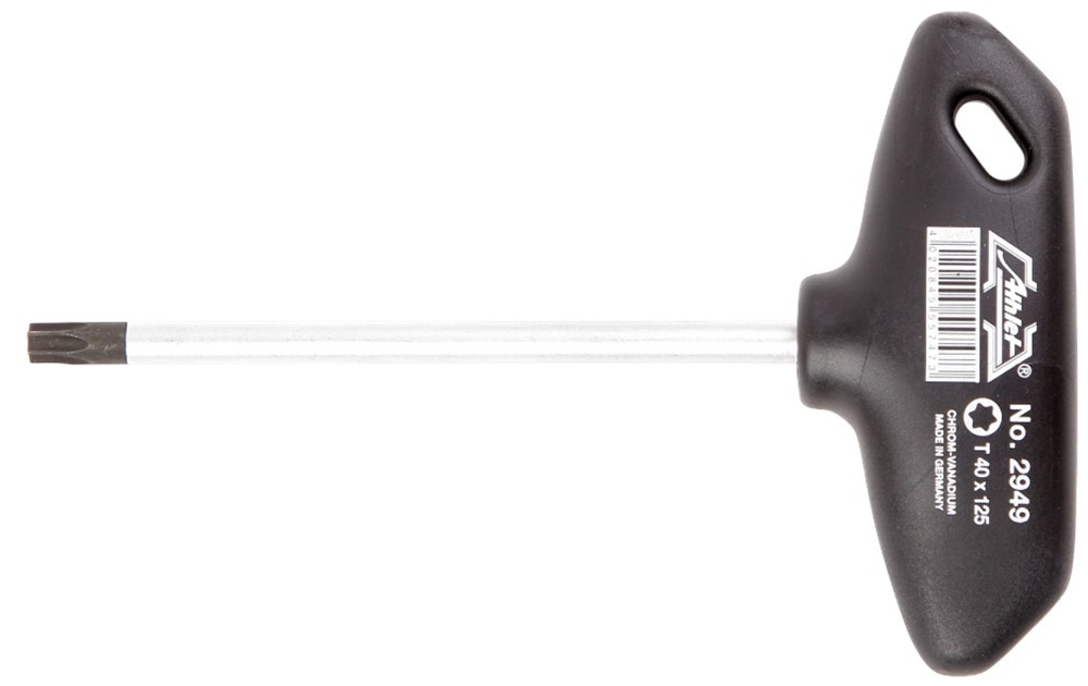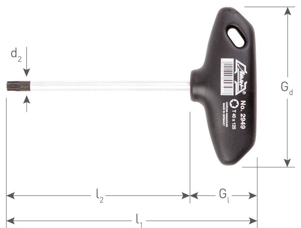 TORX®-Stiftsleutel met ergonomische T-greep gemaakt van speciaal kunststof met hoge slagvastheid en voorzien van ophanggat. Blad gemaakt uit MoV-staal, verchroomd met gebruineerde tip. Volgens DIN EN ISO 10664.