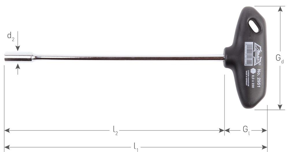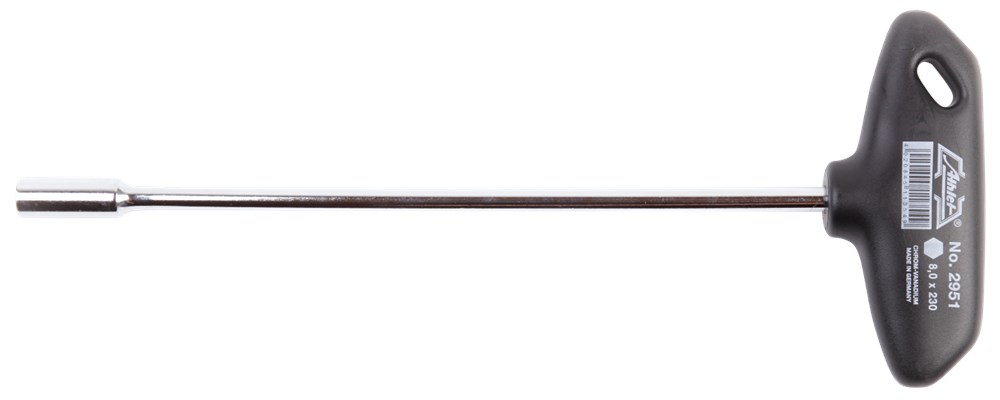 Dopsleutel met ergonomische T-greep gemaakt van speciaal kunststof met hoge slagvastheid en voorzien van ophanggat. Blad gemaakt uit hoogwaardig CrV-staal, verchroomd. Volgens DIN 3125.