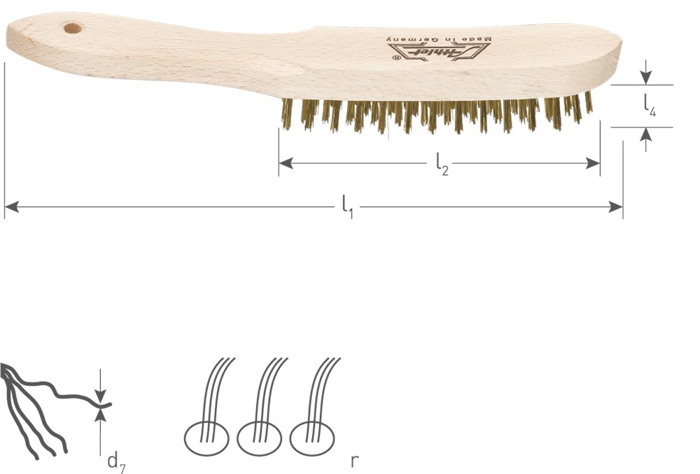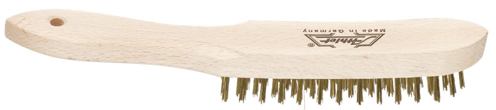 Houten handborstel voorzien van 0,4mm vermessingd kwaliteitsstaaldraad met hoge treksterkte.