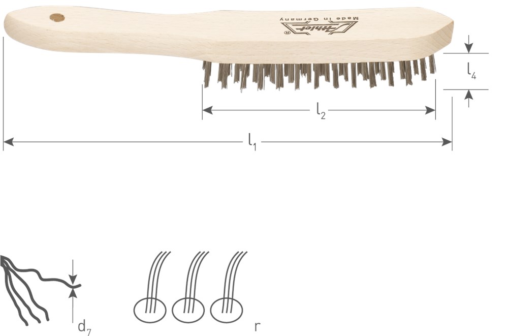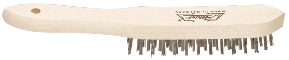 Houten handborstel voorzien van 0,35mm gehard kwaliteitsstaaldraad.