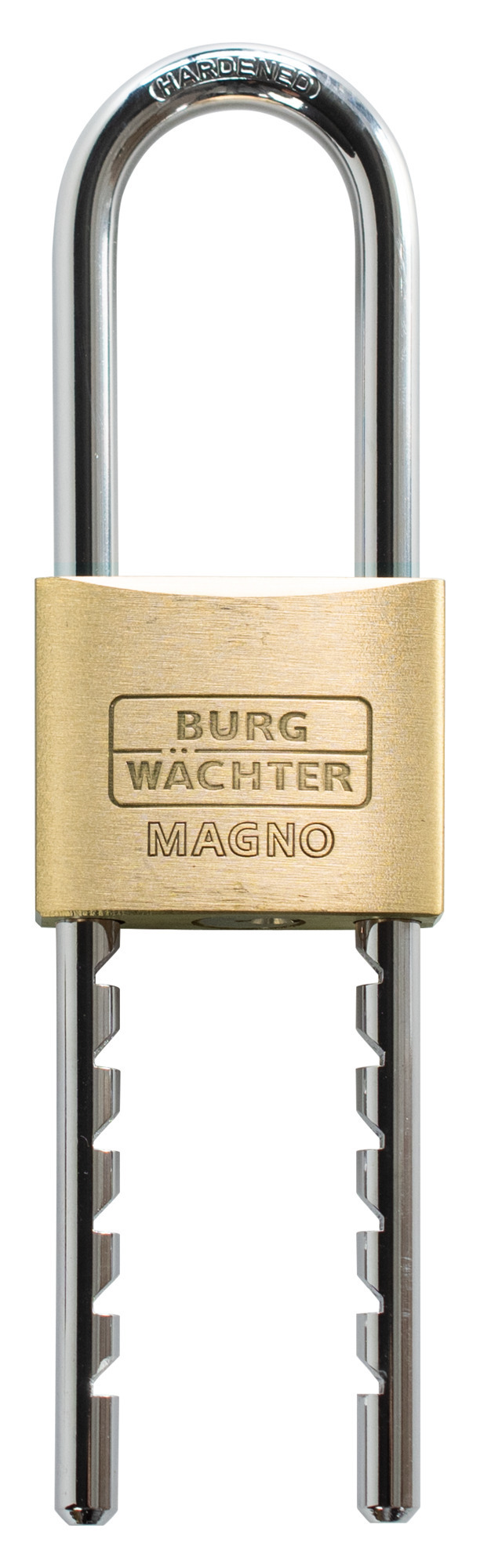 De behuizing is uitgevoerd in massief messing, wat van nature goed bestand is tegen corrosie en slijtage en daardoor lange levensduur garandeert in wisselende omstandigheden. De aanduiding HB 50 verwijst naar de 50 mm maatvoering van het slot, een formaat dat stevig genoeg is voor zware toepassingen maar toch compact blijft voor montage op diverse bevestigingspunten. MAGNO duidt op de speciale sluitingstechnologie die zorgt voor soepel en betrouwbaar insluiten en verhoogde weerstand tegen vuil en stof. De FLEX-aanduiding geeft aan dat dit hangslot is afgestemd op flexibele montagebehoeften, waardoor de beugel eenvoudig past op ongelijke of dikke bevestigingspunten. Voor de professional betekent dit minder passen en meten en meer directe installatie.