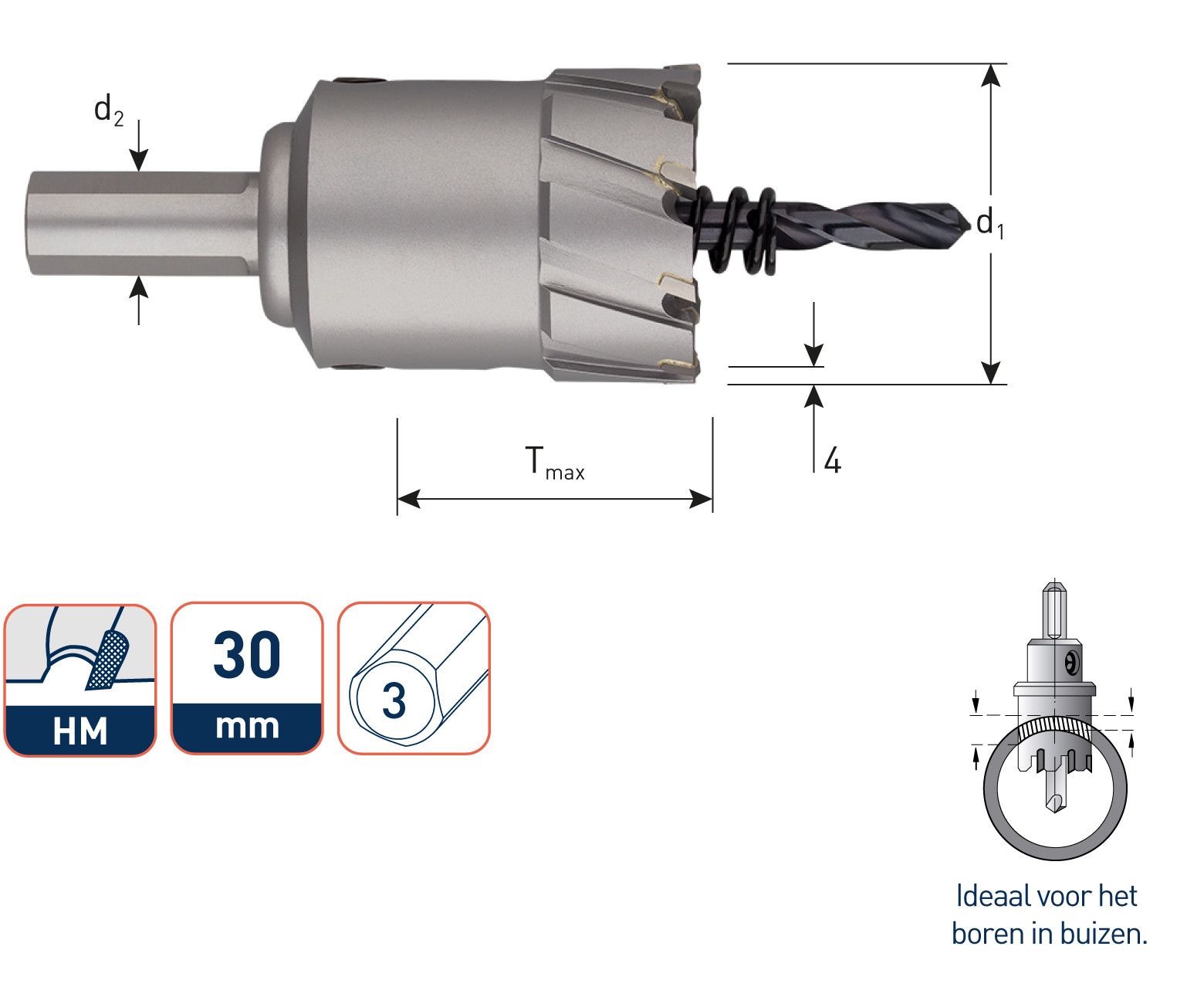 De frees is vervaardigd uit hardmetaal (HM), wat hoge slijtvastheid en bestandheid tegen warmte bij zware toepassingen garandeert. De nominale diameter van 91,0 mm geeft een precieze, ronde opening geschikt voor kabeldoorvoeren, leidingdoorvoer en installatiewerk waar een constante maatvoering essentieel is. De TMAX van 30 mm betekent dat u tot 30 mm materiaaldikte efficiënt en veilig kunt verwerken; dat maakt de frees geschikt voor bewerkingen in dunne plaatmaterialen, hout en kunststof en veel voorkomende bouwmaterialen. Door de stevige constructie blijft de snijkant langer scherp, wat minder wisseltijd en consistentere resultaten oplevert voor zowel de professionele verwerker als de veeleisende doe-het-zelver.