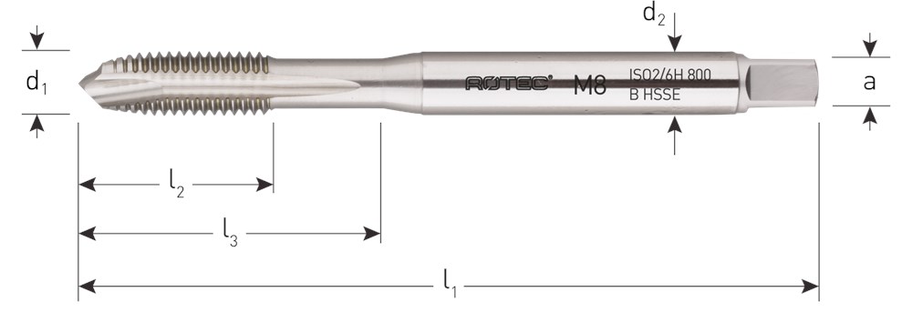 HSS-E machinetappen, DIN 371, metrisch [M], 60°, verdikte schacht, type B met schilaansnijding.