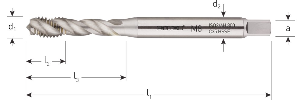 HSS-E machinetappen, DIN 371, metrisch [M], 60°, verdikte schacht, type C, spiraalhoek 35°.