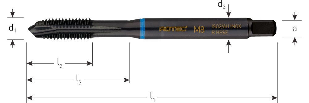 High-performance HSS-E blauwring machinetap DIN 371, metrisch [M], 60°, ISO2 (6H), verdikte schacht, type B met schilaansnijding.