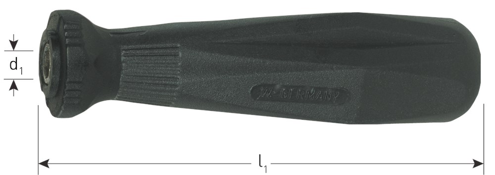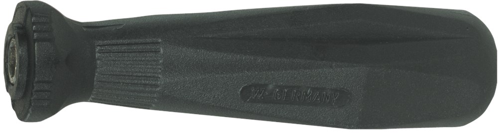 Ergonomisch gevormde kunststoffen handvat voorzien van een spanring voor de opname van verzinkfrezen.