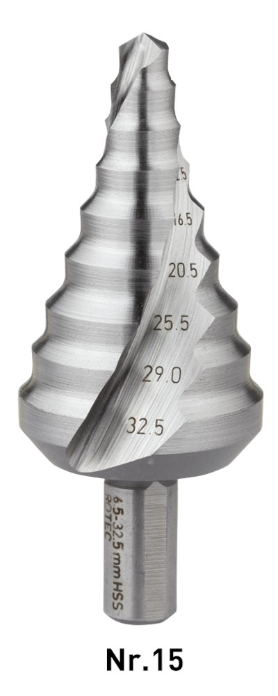 De trappenboor is voor de meest voorkomende materialen geschikt: non-ferro metaal, plaatstaal tot 4 mm, thermoplastische en duroplastische kunststoffen. Met Rotec snijolie RS50 of Rotec snijpasta kan de levensduur aanzienlijk worden verlengd.