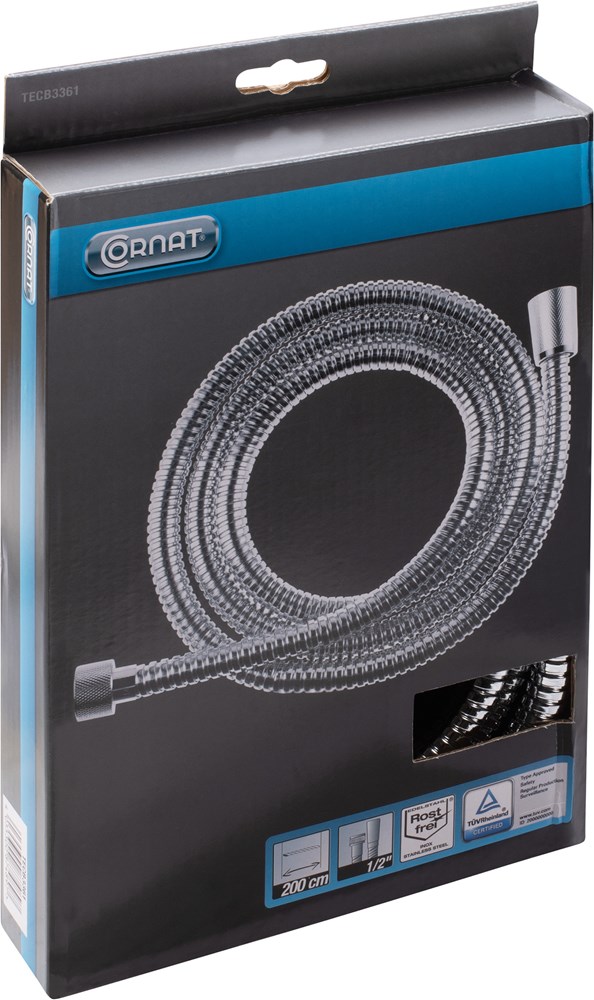 De metalen doucheslang van Cornat is de ideale aansluiting voor je handdouche. Hij kan eenvoudig en veilig worden bevestigd op elke 1/2 inch aansluiting. Met zijn klassieke metalen look past de slang perfect bij elke chromen douche. De slanglengte van 150 cm zorgt voor bewegingsvrijheid en garandeert je een comfortabele douche-ervaring. Dankzij de hoogwaardige verchroming is het materiaal bovendien corrosiebestendig en gemakkelijk schoon te maken.