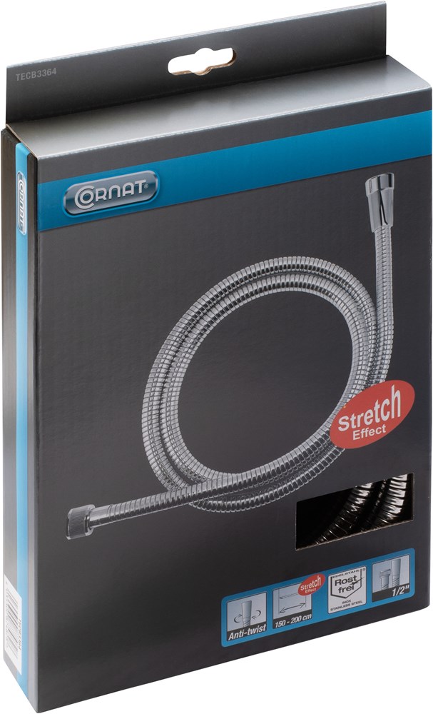 De metalen doucheslang van Cornat is de ideale aansluiting voor je handdouche. Hij kan eenvoudig en veilig worden bevestigd op elke 1/2 inch aansluiting. Met zijn klassieke metalen look past de slang perfect bij elke chromen douche. De flexibele slanglengte van 150 tot 200 cm zorgt voor bewegingsvrijheid en garandeert je een comfortabele douche-ervaring. Dankzij de hoogwaardige verchroming is het materiaal bovendien corrosiebestendig en gemakkelijk schoon te maken.