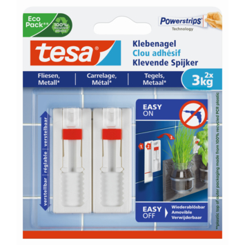 tesa® Verstelbare Klevende Spijkers voor Tegels & Metaal hebben een draagkracht tot 3kg (en twee plakspijkers tot 6kg). Ze zijn ideaal voor het ophangen van voorwerpen op gladde en harde oppervlakken binnenshuis en zijn een betrouwbare manier om voorwerpen, zoals kruidenrekken en lijsten, op te hangen en uit te lijnen. Powerstrips® Technologie zorgt ervoor dat de Klevende Spijkers in een oogwenk kunnen worden verwijderd zonder zichtbare resten achter te laten. Opnieuw gebruiken van de Klevende Spijker is ook eenvoudig: haal gewoon een navulverpakking van de bijpassende Kleefstrips.