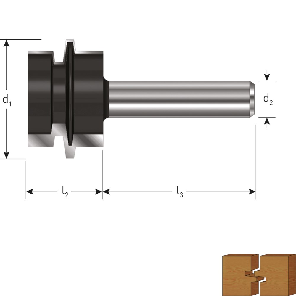 Tweesnijder. Zorgt voor een groot verlijmoppervlak. Voor hout tot max. 25 mm dik.