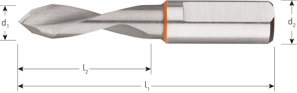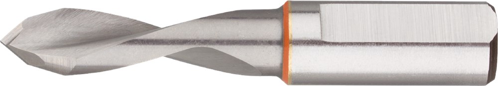 VHM drevelboor, 60° centreerpunt, cilindrische schacht met spanvlak en instelschroef. Linksdraaiend.