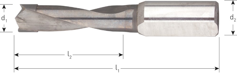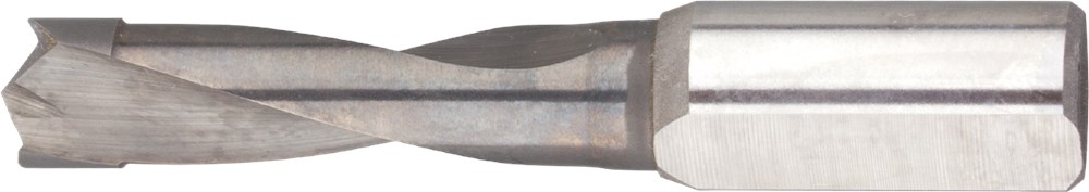 VHM drevelboor, centreerpunt, cilindrische schacht met spanvlak en instelschroef. Rechtsdraaiend.