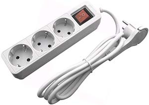 Tafelcontactdoos met randaarde 3 voudig langwerpig 1,5 meter snoer 3x1 qmm Maximaal 2500 Watt Kleur wit Stekker kan door de opklapbare beugel makkelijk uit het stopcontact worden getrokken. Met schakelaar + controlelampje